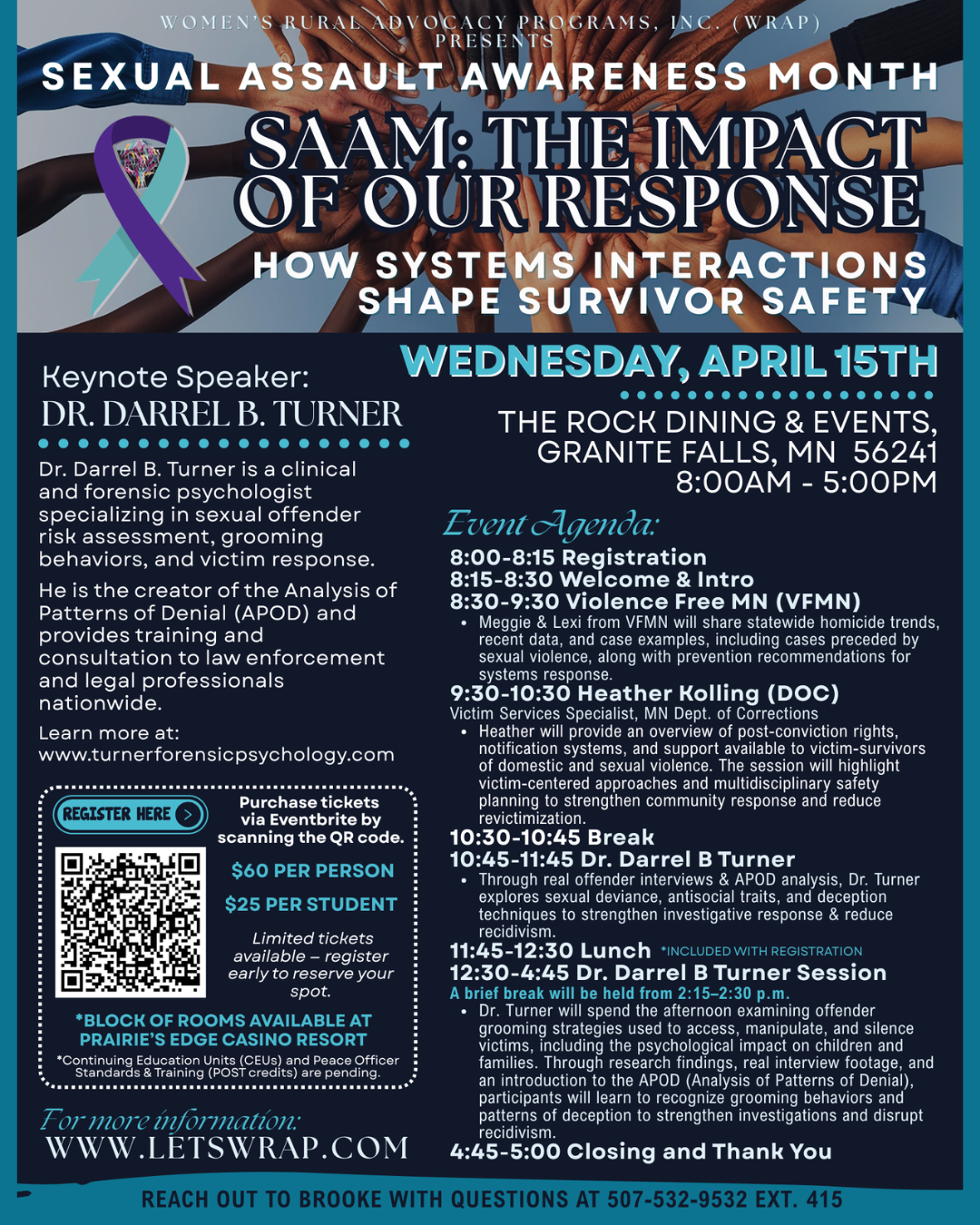 Join us for a comprehensive, full-day training focused on how systems interactions influence survivor safety and offender accountability. Featuring statewide homicide data and prevention insights from Violence Free Minnesota, perspectives from the Minnesota Department of Corrections, and in-depth forensic analysis from Dr. Darrel B. Turner, this event equips professionals with practical tools to strengthen coordinated response efforts. Dr. Turner will examine sexual deviance, grooming dynamics, psychopathy, and patterns of denial through real interview footage and APOD analysis to enhance investigative effectiveness and disrupt recidivism. Designed for advocates, law enforcement, attorneys, and allied professionals, this training promotes deeper understanding across disciplines to improve outcomes for victims and communities.There is a room block at Prairie’s Edge Casino hotel. Rooms must be booked by 4/6/2026